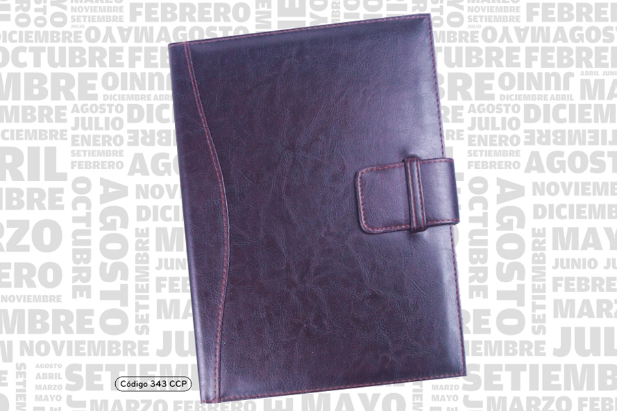 Tapa con carpeta, cosida a hilo, detalle en lomo,presilla, bolsillo, porta bolígrafo.