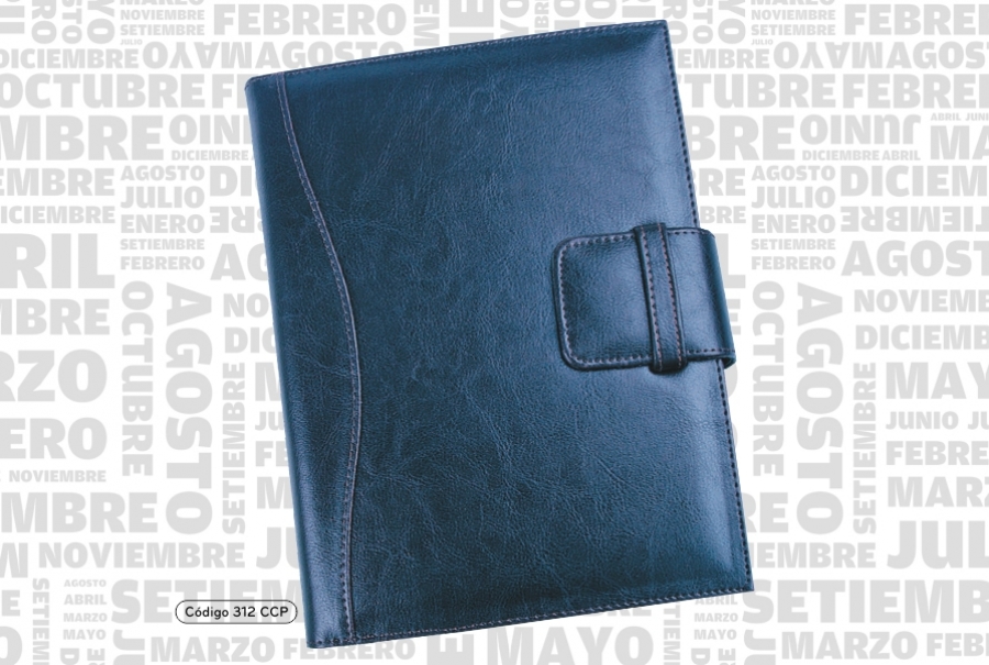 Tapa con carpeta, detalle en lomo, presilla, bolsillo, porta bolígrafo.